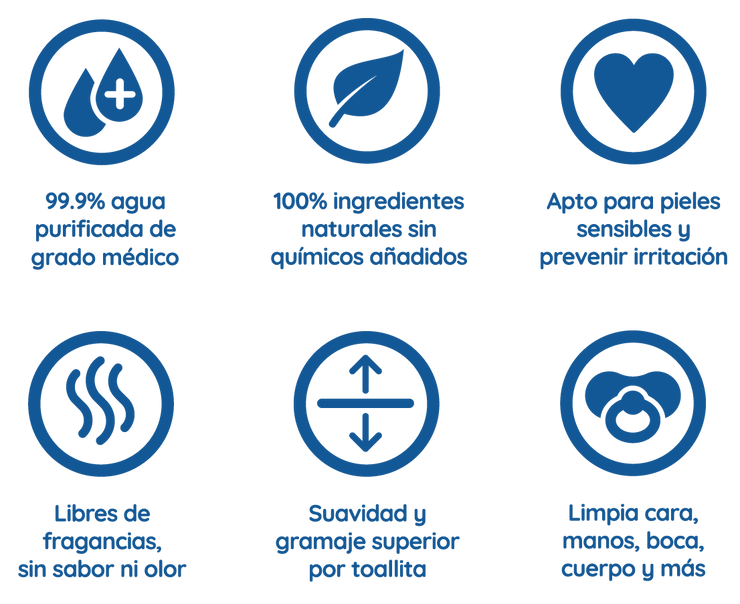 Nuestras toallitas húmedas sólo estan compuestas por dos ingredientes: 99.9% de agua purificada de grado médico y un 0.1% de aloe vera. No contienen químicos, fragancias ni alcohol, debido a esto, son aptas para uso en recién nacidos y bebés con pieles sensibles.